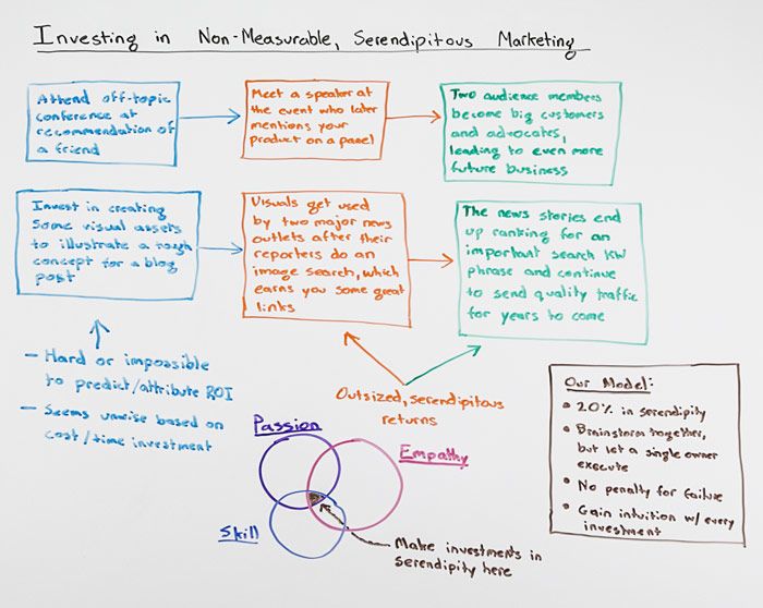 Howdy Moz fans, and welcome to another edition of Whiteboard Friday. This week I want to talk about something that we don't usually talk about in the inbound marketing world because inbound, of course, is such a hyper-measurable channel, at least most of the investments that we make are very measurable, but I love serendipitous marketing too. That's investing in serendipity to earn out-sized returns that you might not be able to make. That's a tough sell for a lot of management, for a lot of executives, for a lot of marketers because we're so accustomed to this new world of hyper-measurability. But with a couple examples, I'll illustrate what I mean.