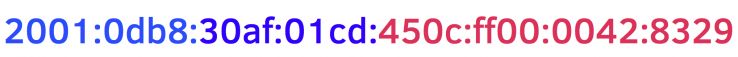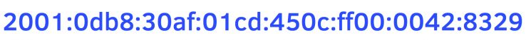 Things just got serious! There are now 8 blocks rather than 4, and rather than each block being 1 byte (which were represented as a number from 0-255), each block is instead 2 bytes represented by 4 hexadecimal characters. There are 128 bits in an IPv6 address, meaning instead of a measly 4,000,000,000 like IPv4, IPv6 has around 340,000,000,000,000,000,000,000,000,000,000,000,000 addresses.