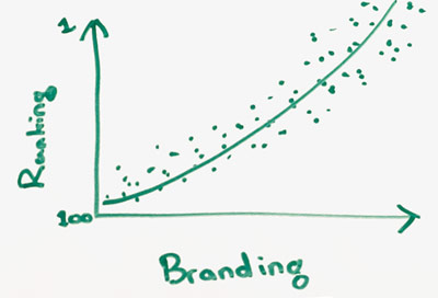 If we were to scatter plot it, we'd probably see something like this, where the better your brand performs as a brand, the higher and better it tends to perform in the rankings of Google search engine.