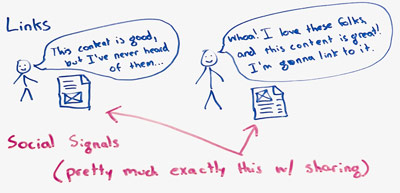 These are pretty much exactly the same thing. Folks who visit content, who have experiences with a company, with a product, or with a service, if they're familiar and comfortable with the brand, if they want to evangelize that brand, then guess what? You're going to get more social sharing per visit, per exposure than you would ordinarily, and that's going to lead to a cycle of more social sharing which leads to visits which probably leads to links.