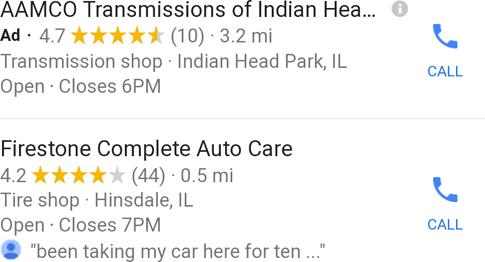 Below is the new ad format in a local pack result. Note that I've removed the surrounding design elements (including rounded boxes) to focus on the elements that have changed ...