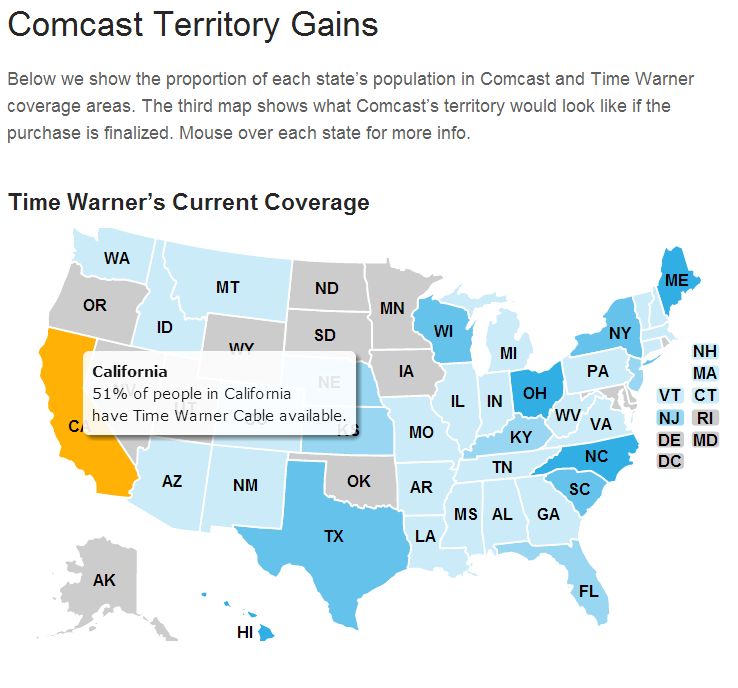 For example, when the CableTV team heard about the potential Comcast/Time Warner merger, we knew simply sharing the news would be a waste of time. Every major news outlet would easily drown out our site, and opinion pieces where popping up everywhere. Instead, we crunched some numbers, comparing U.S. Census data with coverage data, producing a coverage and population analysis people could see and understand. A few large news organizations used the data in ongoing analysis, Reddit's founder (Alexis Ohanian) shared the post, and roughly 60,000 people ended up seeing it.