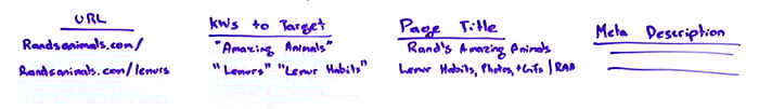 So it should look something like this. It's got the URL, so RandsAnimals.com, targeting the keyword "amazing animals," and here's the page title and here's the meta description. Then, I've got RandsAnimals.com/lemurs, which is my page about lemurs, and that's targeting "lemurs" and "lemur habits." There's the title.
