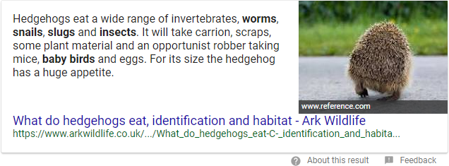 For example, let's say a hedgehog wanders into your house and you naturally find yourself wondering what you should feed it. You might search for "What do hedgehogs eat?" On desktop, you'd see a Featured Snippet like the following: