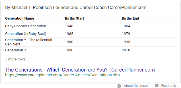 Table snippets made up less than 2% of the Featured Snippets in our starting data set. These snippets contain a small amount of tabular data, like this search for "What generation am I?":