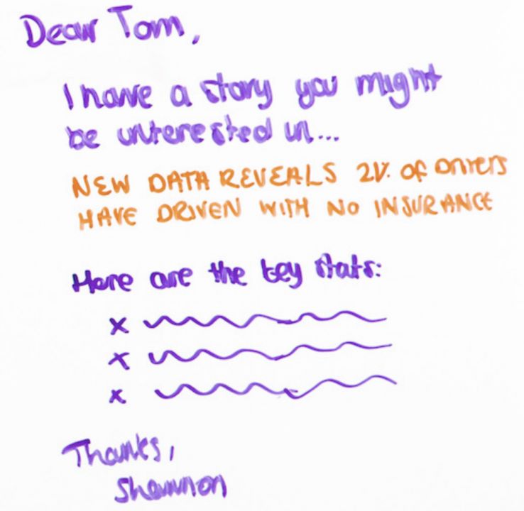 So here's an example. "New data reveals that 21% of drivers have driven with no insurance." Not the most exciting headline in the world. But if Tom here is an automotive editor or a digital online automotive writer, straightaway he knows what I'm talking to him about. Again, he can start to see how this data can be used to craft stories for his own audience.