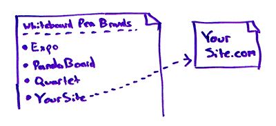 Then in each of those cases, I would submit or I would try and contact or get in touch with whoever runs that list and say, "Hey, my company, my organization also belongs on here because, like these other ones you've listed, we do the same thing." So if it's here's whiteboard pen brands, Expo, PandaBoard, Quartet, and your site, which should now link to YourSite.com.