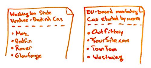 For example, Washington state venture-backed companies. Moz is a venture-backed company, so I could potentially get on that list. Or the EU-based manufacturing companies started by women, and I could get on that list with my whiteboard pen company based there. You can find lots and lots of these if you sort of take from your list, start searching Google and discover those results. You'll use the same process you did here.