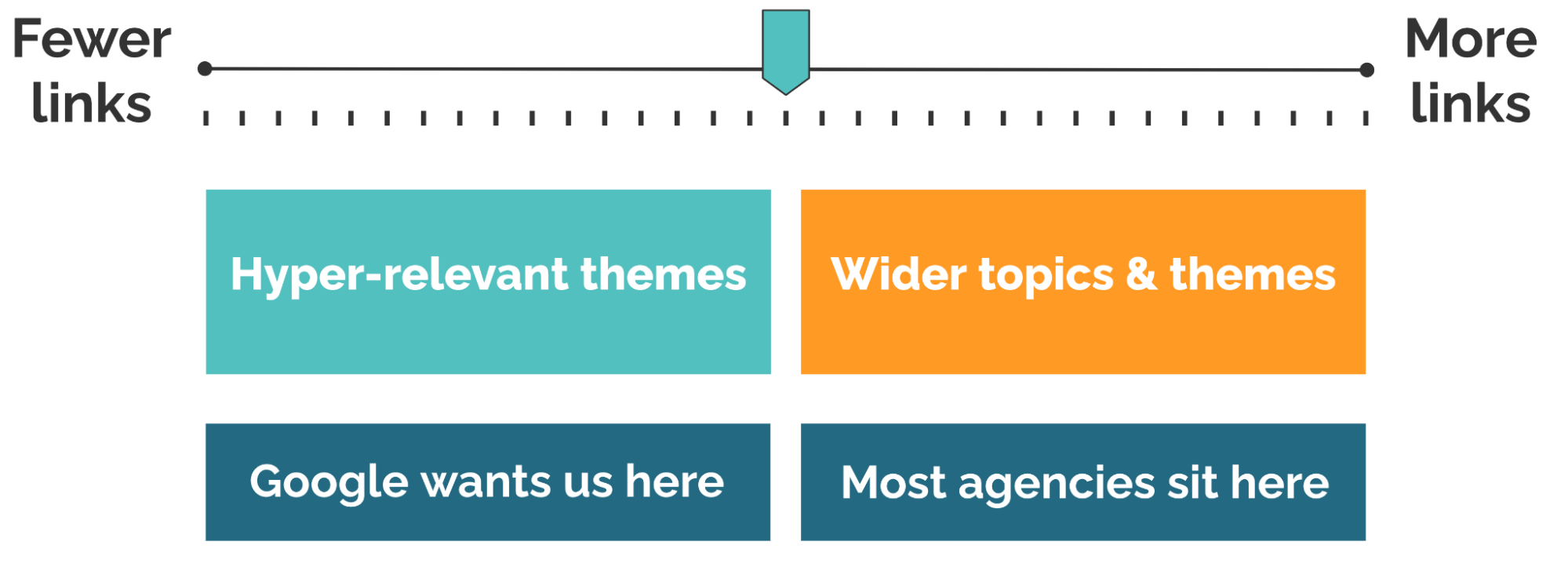 As you can see, many agencies (and in-house teams!) sit toward the right and are prepared to go wider with topics and themes because it can lead to more links. Irrelevance is driven by the pressure to build large volumes of links, and our industry does a great job of showcasing link building campaigns that have gotten hundreds of links, so we believe that this is what all of us should be aiming for.