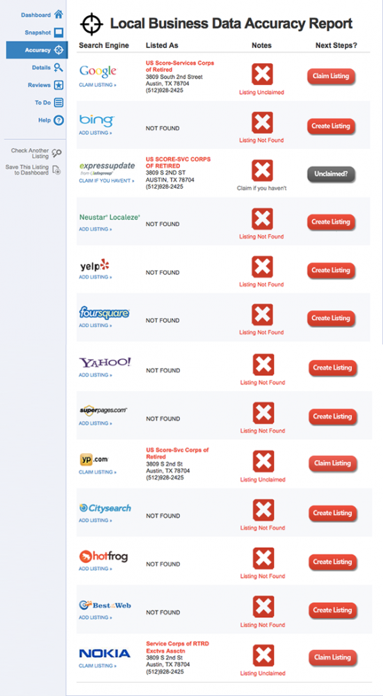 The first thing I did was to run an Accuracy Report on GetListed for both SCORE's old and new NAP information. I wanted to see which search engines had indexed which location(s), and in what manner.
