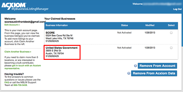 Correct (New) NAP: SCORE Austin 5524 Bee Cave Rd., Building M Austin, TX 78746 (512) 928-2425 |