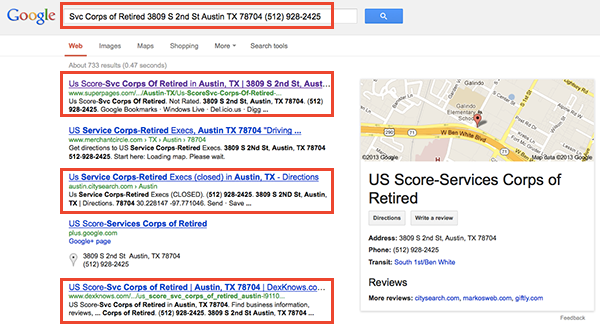 Incorrect (Old) NAP: SCORE Austin 3809 S 2nd St Austin, TX 78704 (512) 928-2425 |