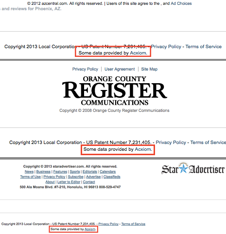 Pay special attention to the bottom of the webpages where your information is incorrect. Many of these are local directory sites where you will be able to update the information yourself--but they, in turn, may be getting this misinformation from another source. Good examples of this in SCORE's case were sites like this one for the Honolulu Star-Advertiser -- a newspaper that was not even in SCORE's market -- which was supplied with data by both Local.com and Acxiom.