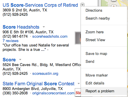 SCORE’s Austin chapter recently moved to a location about eight miles northwest of its old local headquarters. Unfortunately, Google was displaying its former headquarters right on the main search result for “SCORE Austin,” and SCORE clients were actually visiting the old address for meetings and workshops. (In fairness to Google, other search engines were confused as well, though not quite to the same extent.)
