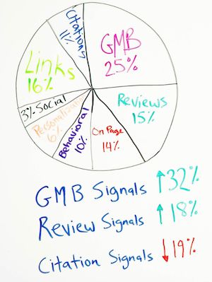 The big story this year is Google My Business. Google My Business factors are way up, compared to last year, a 32% increase in Google My Business signals. I'll talk about that a little bit more over in the takeaways. Review signals are also up, so more emphasis on reviews this year from the practitioners. Citation signals are down again, and that makes sense. They continue to decline I think for a number of reasons. They used to be the go-to factor for local search. You just built out as many citations as you could. Now the local search algorithm is so much more complicated and there's so much more to it that it's being diluted by all of the other factors. Plus it used to be a real competitive difference-maker. Now it's not, because everyone is pretty much getting citations. They're considered table stakes now. By seeing a drop here, it doesn't mean you should stop doing them. They're just not the competitive difference-maker they used to be. You still need to get listed on all of the important sites.