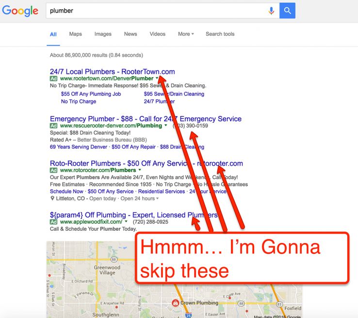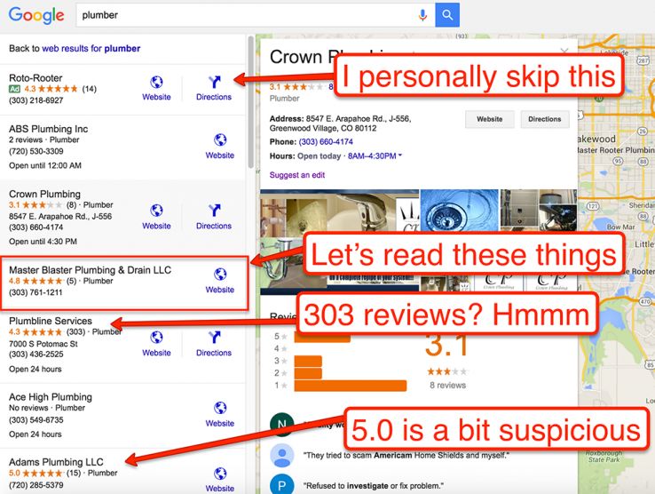 Step 1: Search for a local plumber. I skip the paid ads because I feel bad clicking on them.