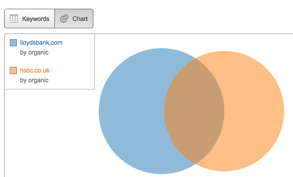Next, click on the chart button and you will be presented with two overlapping circles, representing the keywords that each domain ranks for. As we can see, both rank for a similar number of keywords (the overall number affects the size of the circles) with some overlap but there are keywords from both sides that could be exploited.