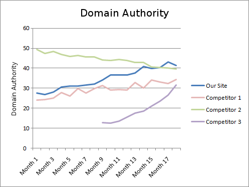 This chart tracks the Site Authority of the target domain (and some competitors) through time.