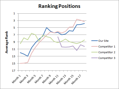 The competitor lines should be calculated by finding the mean ranking position of that site, for each of these keywords where the site ranks in the top 20. (We do this so that the mean isn't artificially dragged down by keyphrases which the site isn't trying to compete for, and where it ranks very poorly.)