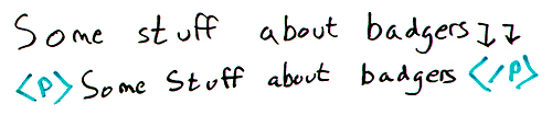 Paragraphs are created automatically. So if you write some text and you hit Enter or return twice, you'll get a clean paragraph. If you want, by the way, for this to be a hard break instead, then you just do two spaces and then return, and it'll put a BR there instead of a paragraph.