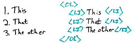 Lists become lists, and this is one of the toughest things for writers. It was always the thing that slows me down the most is lists are pretty complicated in HTML. Well, here, you just go one, two, three, just normally your text, and when you save it and convert it, it's going to become order list, list item, list item, list item, closing order list. It's that easy. If you want to do a bulleted list, you just use asterisks instead. It'll do the same thing.