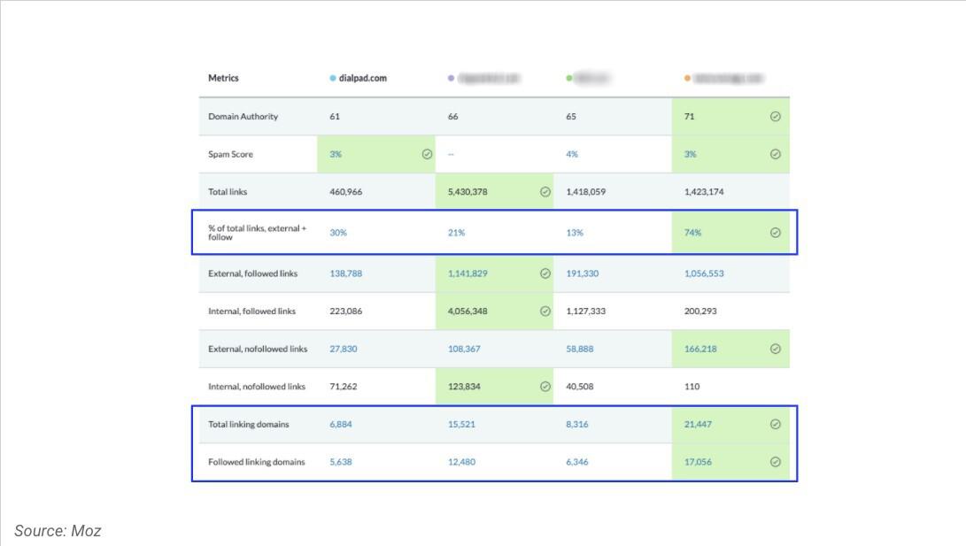 To get the ideas flowing, I first looked at what our (Dialpad’s) competitors have done, and identified what worked or didn’t. I took a screenshot from Moz Pro’s Compare Link Profiles feature and included it in my deck to provide context for what Dialpad was up against at the time.