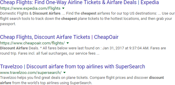 Here, Google is free to match on synonyms for "discount" (such as "cheapest"), but every result is forced to include "airfare." Exact-match single words when you want to exclude variations of that word.