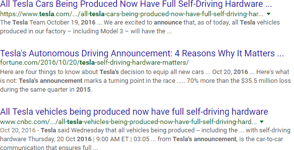 Browsing these results, you can see quickly that Tesla is also a band and a unit of measurement. In addition, Tesla the company makes products other than cars. Keyword exclusions are also called "negative keywords" (thus the minus sign).