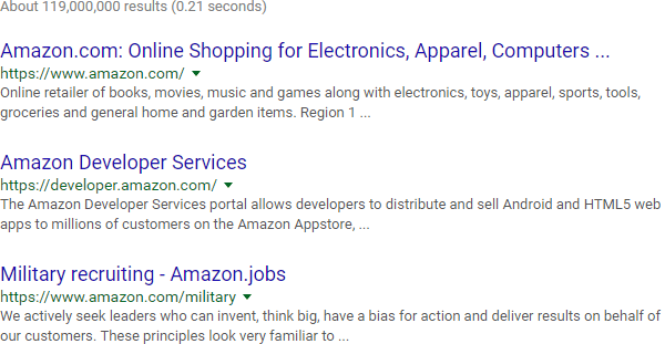 It all starts with the "site:" operator, which, at its most basic level, can help you get a glimpse of how Google indexes a site. Here are a few results from Google's index of Amazon.com: