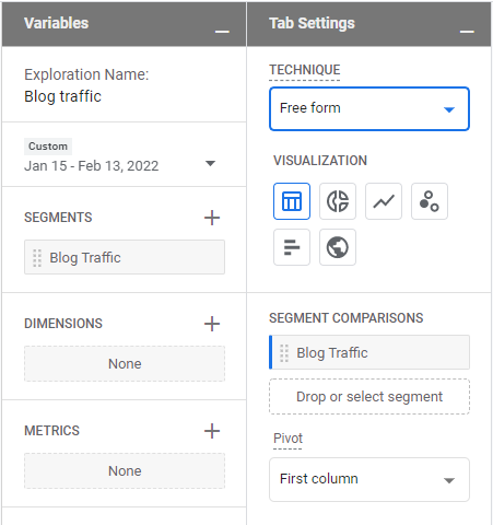 Once you’ve set up your report, with Explore, you can customize the metrics to view in your reports and choose how to visualize it, unlike Universal Analytics. The world is your oyster to create custom content-based reports here!