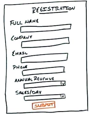 So in this video, I want to use just an example of a registration form. Pretty simple registration form. Fields for name, company name, email address, phone number, revenue, and sales per day, basic information. We've all seen forms like this on different websites. So what we want to know is not just how many people arrived on this page, looked at this form, how many people completed this form.