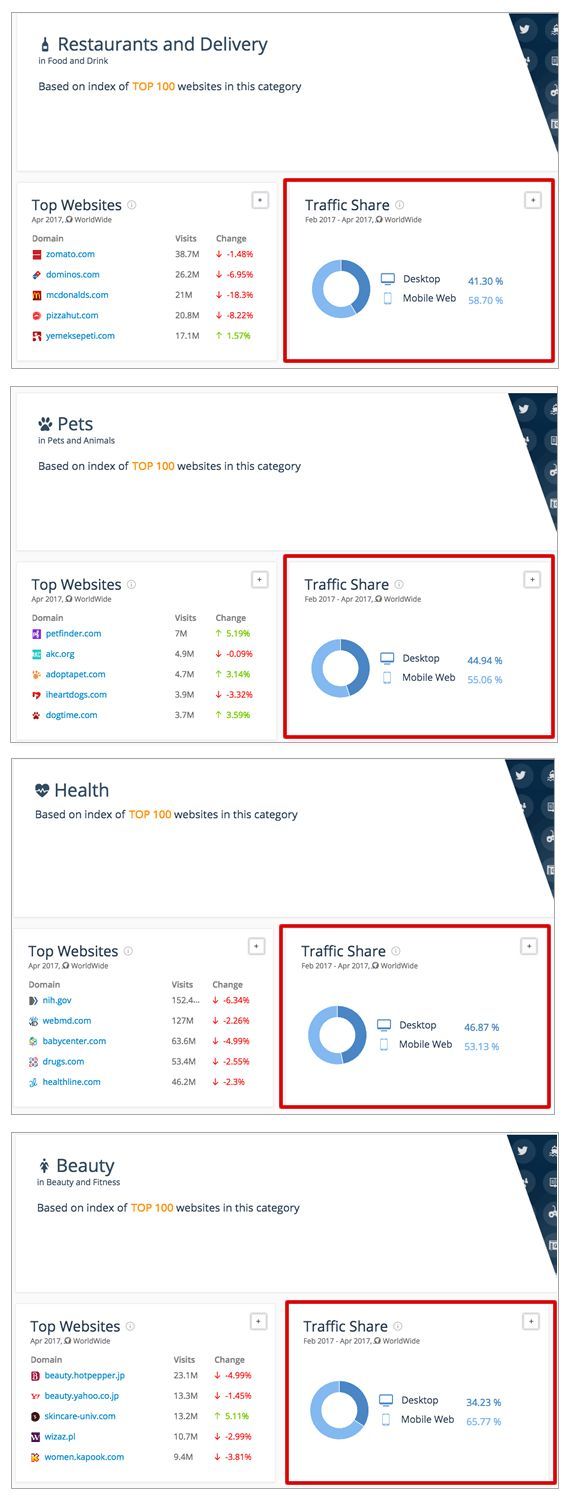 The reality is that due to high mobile usage across certain industries and countries, it's already critical to take mobile search behavior and optimization into consideration to establish a winning SEO strategy. For example, as can be seen below in data obtained from SimilarWeb, this is especially important in the restaurants & delivery, health, pets, and beauty sectors, as well as many others: