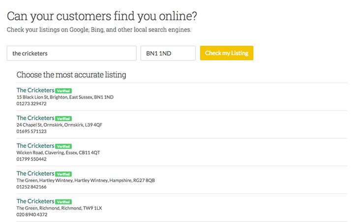 To use the product, you simply need to type a name and postcode at moz.rainyclouds.online/local. We'll then show you a list of the closest matching listings we found. We prioritize verified listing information that we find on Google or Facebook, and selecting one of those verified listings means we'll be able to distribute it on your behalf.