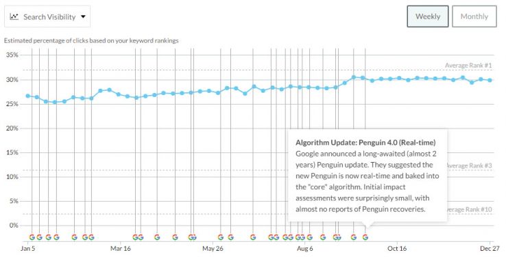 See a dramatic change in your rankings overnight? We now leverage the great data from MozCast to show any Google algorithm changes that might be affecting your search presence. Just hover over the little Google "G" to see major and minor update details.