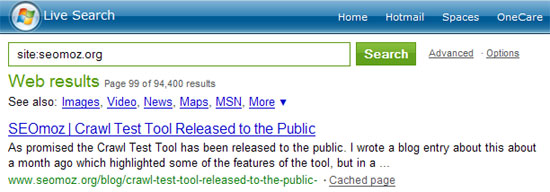I'll use SEOmoz as an example. Searching for "site:seomoz.org" returns 94,500 results: