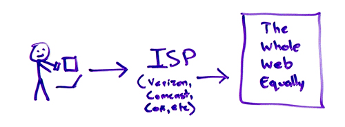 But essentially, net neutrality is this idea that as a user of the Internet, through my Internet service provider — that might be through my cellphone network, that might be through my home Internet provider, through my Internet provider at work, these ISPs, a Verizon or a Comcast or a Cox or a T-Mobile or AT&T, those are all here in the United States and there are plenty of others overseas — you essentially can get access to the whole web equally, meaning that these ISPs are not regulating download speed based on someone paying them more or less or based on a website being favored by them or owned by them or invested in by them. Essentially, when you get access to the web, you get access to it equally. There's equality and neutrality for the entire Internet.