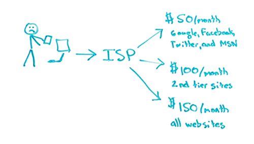 In a non-neutrality scenario, you can see my little fellow here is very unhappy, because his ISP is essentially regulating and saying, "Hey, if you want to pay us $50 a month, you can have access to Google, Facebook, Twitter, and MSN. Then if you want to pay a little bit more, $100 a month, you can get access to all these second-tier sites, and we'll let you visit those and use those services. If you want to pay us $150 a month, you can get access to all websites."