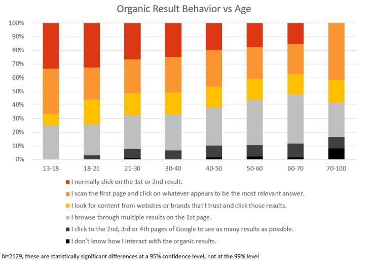 According to these results, younger users are more likely to click on the first 1–2 results on page one, while older users are more likely to explore additional results, browsing farther down on the first page — or even onto the second and third pages — to find the information they're looking for.