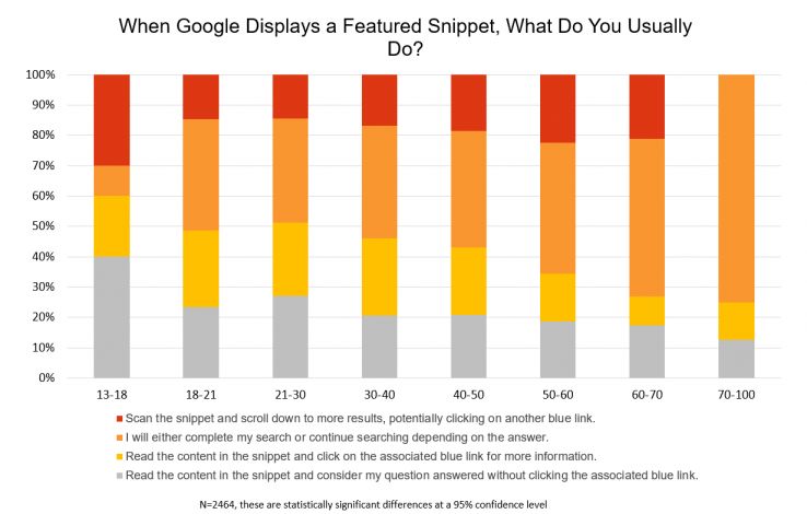 However, this data suggests another potentially alarming trend as it relates to featured snippet interactions and age: the youngest searchers (13–18) are 220 percent more likely than the oldest searchers (70–100) to consider their question answered without clicking on the snippet (or any) result. Conversely, the older respondents (60–100) are 170 percent more likely to continue searching, depending on the answer in the snippet. This again points to younger searchers seeming to prioritize getting a response quickly, while older users are more likely to spend time evaluating a variety of results.