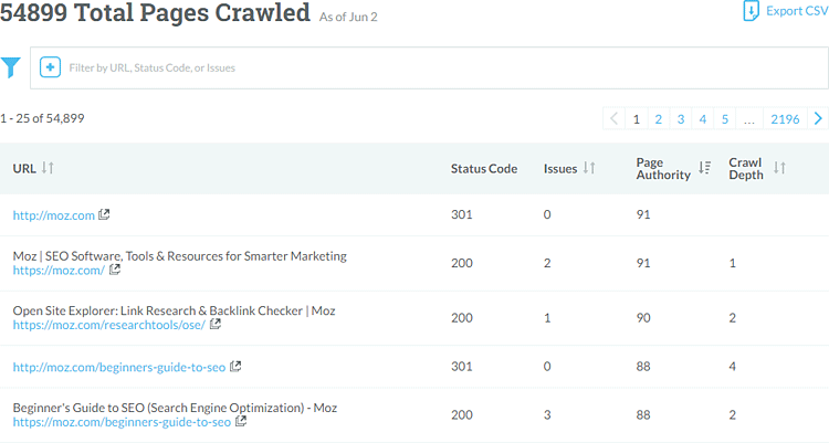 One major limitation of our old crawler is that you could only see pages with known issues. Click on "All Crawled Pages" in the new crawler, and you'll be brought to a list of every URL we crawled on your site during the last crawl cycle: