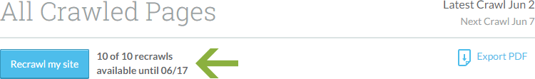 Sometimes, you just can't wait a week for a new crawl. Maybe you relaunched your site or made major changes, and you have to know quickly if those changes are working. No problem, just click "Recrawl my site" from the top of any page in the Site Crawl section, and you'll be on your way...