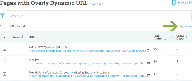 As many customers have reminded us over the years, technical SEO is not a one-sized-fits-all task, and what's critical for one site is barely a nuisance for another. For example, let's say I don't care about a handful of overly dynamic URLs (for many sites, it's a minor issue). With the new Site Crawl, I can just select those issues and then "Ignore" them (see the green arrow for location):