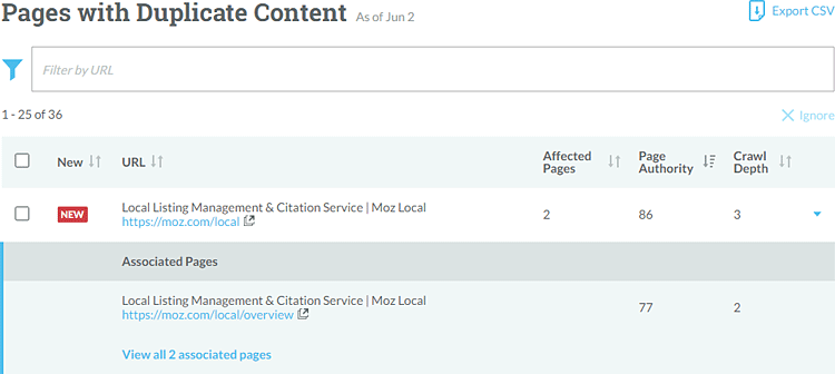 You can view duplicates by the total number of affected pages, PA, and crawl depth, and you can filter by URL. Click on the arrow (far-right column) for all of the pages in the cluster (shown in the screenshot). Click anywhere in the current table row to get a full profile, including the source page we found that link on.