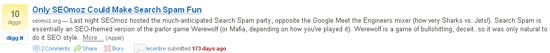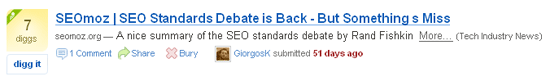 Let's go back to the Web 2.0 Awards submission comments. The actual awards are great--you know it, I know it, lots of us know it. But what does the average Digger see when he clicks on the submission and sees the comments? He sees a built-in community praising the author, SEOmoz, and talking about how this was great "linkbait." Most of you are fully aware of SEO's negative reputation, especially on Digg. Many stories that are SEO or SEM-centric or that are too marketing aggressive get buried pretty quickly because they're seen as spam. These comments all seem to come from a bunch of people who know each other and praise the successful "linkbait" (admittedly, a pretty spammy and negative-sounding term, even though we know that it's not necessarily the case) of the Web 2.0 Awards, so what's a Digger to think? I'd wager they say, "This is spam," hit the Bury button, and browse the rest of Digg. The bury not only hurts the story's chances of making it on the home page, it also isn't good for the submitter to be associated with what is perceived to be spammy content. The submitter's success ratio and reputation are compromised, driving him into a downward spiral of alcoholism and hard drugs (okay, maybe not, but it's still not good).