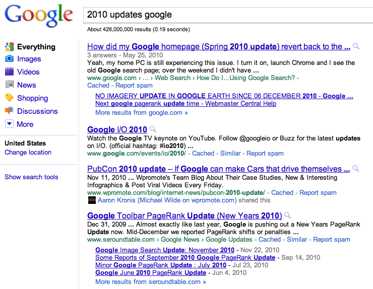 Around the same time as Mayday, Google released the Caffeine Index. This provided Google a way of offering fresher content, faster. The update helped get content found and indexed faster and lead to the future of SERPs pages that included social and integrated local results (which we will discuss later).
