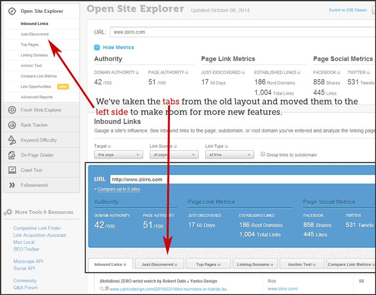 We know a lot of folks liked the old tab structure but we ran out of space. With this redesign we now have the flexibility to add new features and functionality simply by popping in new sections on the left sidebar menu. It's a little bit more like Moz Analytics, too, and we figure some cohesion between our products is probably wise.