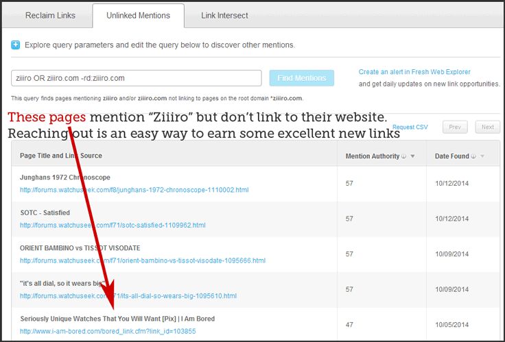Powered by FreshScape, you can use Fresh Web Explorer queries to find mentions of a brand or site without links. Ping sources that may have talked about your brand, website, people, or products without giving you a link and you can often encourage/nudge that link into existence (along with the great SEO benefits they bring)