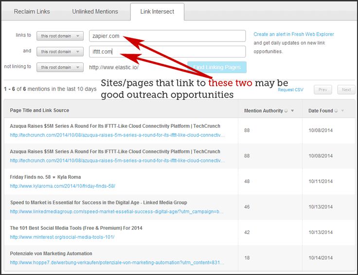 Find pages that are linking to your competitors but not you. By entering two competitive domains (they don't have to be directly competitive; anyone you think you should be on lists with, or mentioned by the press alongside, is a good candidate), you can see pages that link to those sites but not yours. Getting creative with your targets here can reveal loads of awesome link opportunities.