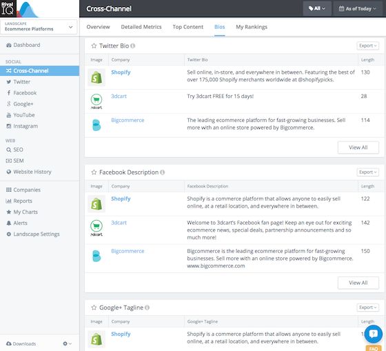 If you're not sure how to best utilize your keyword phrase in your social media bios, look towards your competitors. Analyze each of their top social profiles to see what keyword phrase they use most. You can also use tools like Rival IQ to get a quick overview of their bios for faster analysis.
