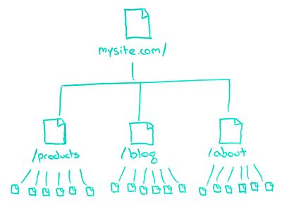 So, for example, if on my site.com I have these three — this is a very simplistic website — but I have these three subfolders: Products, Blog, and About. I might have a page in my products, 14axq.html, and it has certain metrics that Google associates with it through activity that they've seen from browser data, from clickstream data, from search data, and from visit data from the searches and bounces back to the search results, and all these kinds of things, all the engagement and click data that we've been talking about a lot this year on Whiteboard Friday.